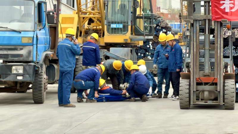 本次演練模擬鋼板區(qū)在進行吊裝作業(yè)時突發(fā)輪胎起重機吊裝貨物擺幅過大傷人事故。演練前期,制定了詳細(xì)方案并組織培訓(xùn),籌備救援、醫(yī)療等物資,布置模擬場景。演練啟動后,通訊聯(lián)絡(luò)組迅速傳遞事故信息,現(xiàn)場指揮組即刻啟動應(yīng)急響應(yīng)。警戒疏散組快速隔離現(xiàn)場、疏散人員;應(yīng)急救援組解救受傷人員、排除設(shè)備故障;醫(yī)療救護組對傷員緊急救治并送醫(yī);后勤保障組及時供應(yīng)物資,各環(huán)節(jié)有序推進。