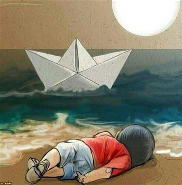 事情發(fā)生后,人們紛紛在網(wǎng)上以漫畫哀悼小Aylan。有像"上帝會在你左右的,小天使"這樣的傷感,也有對難民危機的反思和對戰(zhàn)爭的批判。